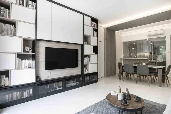 As the family own lots of books, storage shelves were designed as part of the TV feature wall for them to showcase their library.