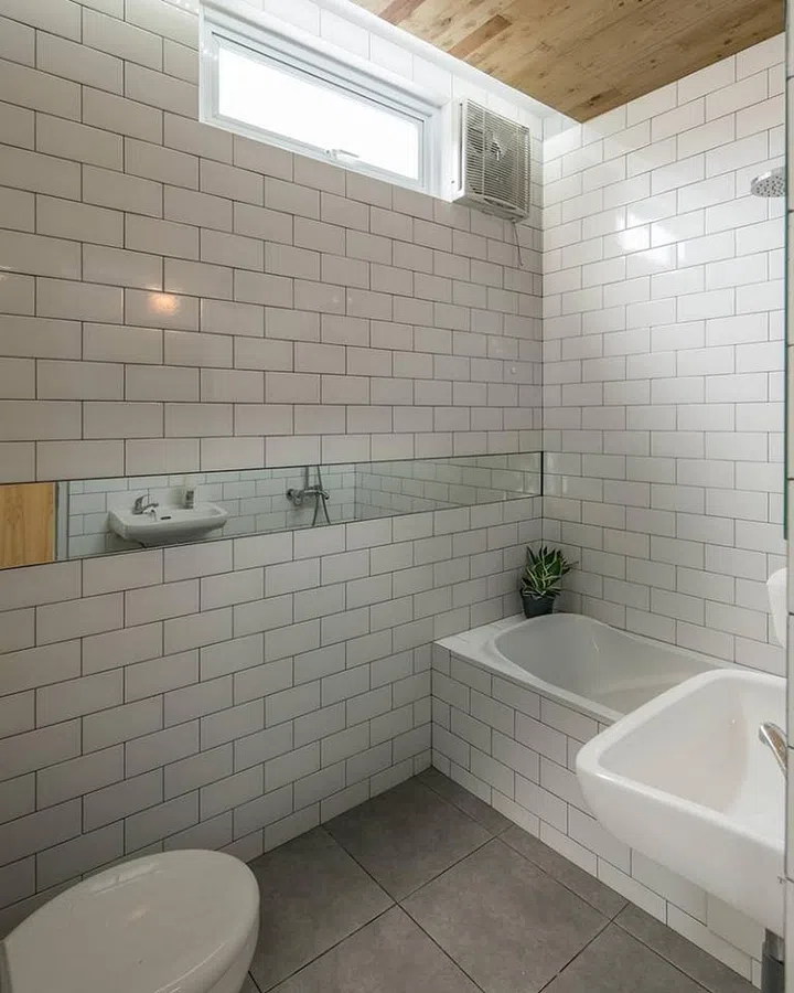 White subway tiles line the bathroom, making the narrow space feel much larger.