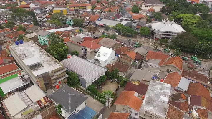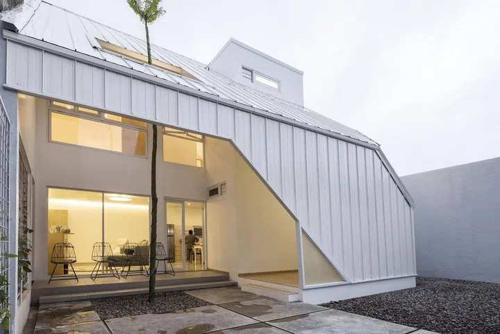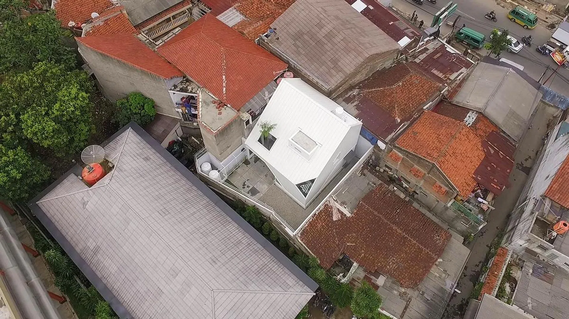 From a distance, the duplex apartment designed by Aaksen Responsible Aarchitecture pops out of the collection of old shophouses in the area like a shiny white bottlecap.