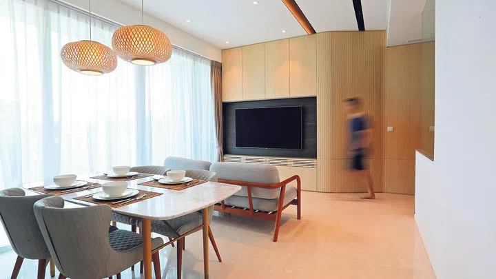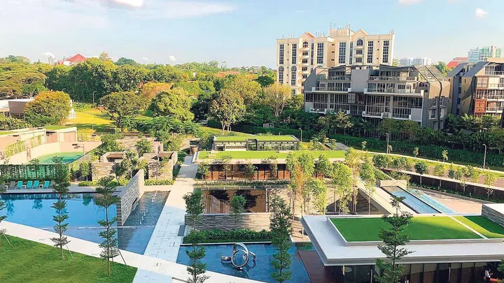 The home is sited within a development where 80 per cent of the premises has been set aside for landscaping and amenities. They can see shared pools, manicured lawns and a gym with a rooftop garden from their living room view of their estate.