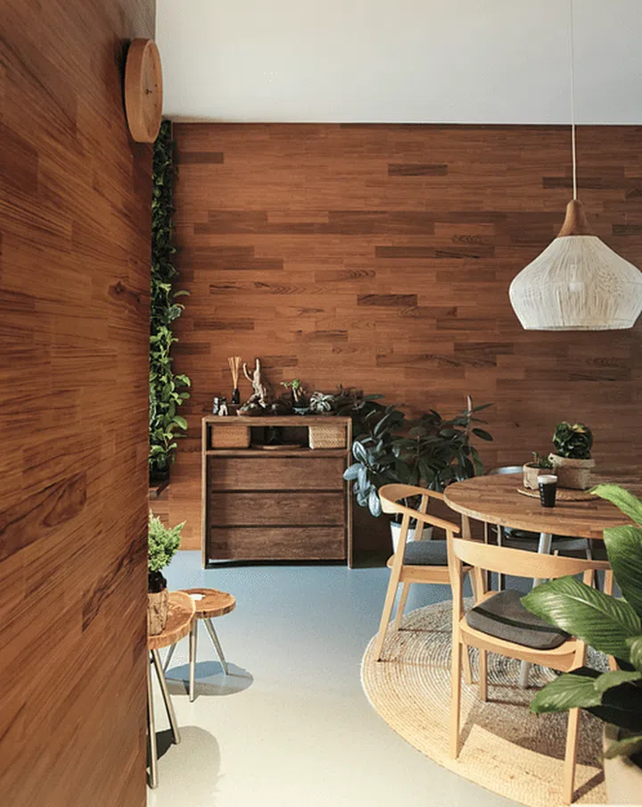 A warm, rustic-chic vibe permeates this three-bedroom condo apartment in Tampines, thanks to the wood tones and greenery in the form of material finishes, furnishings and a copious amount of plants.