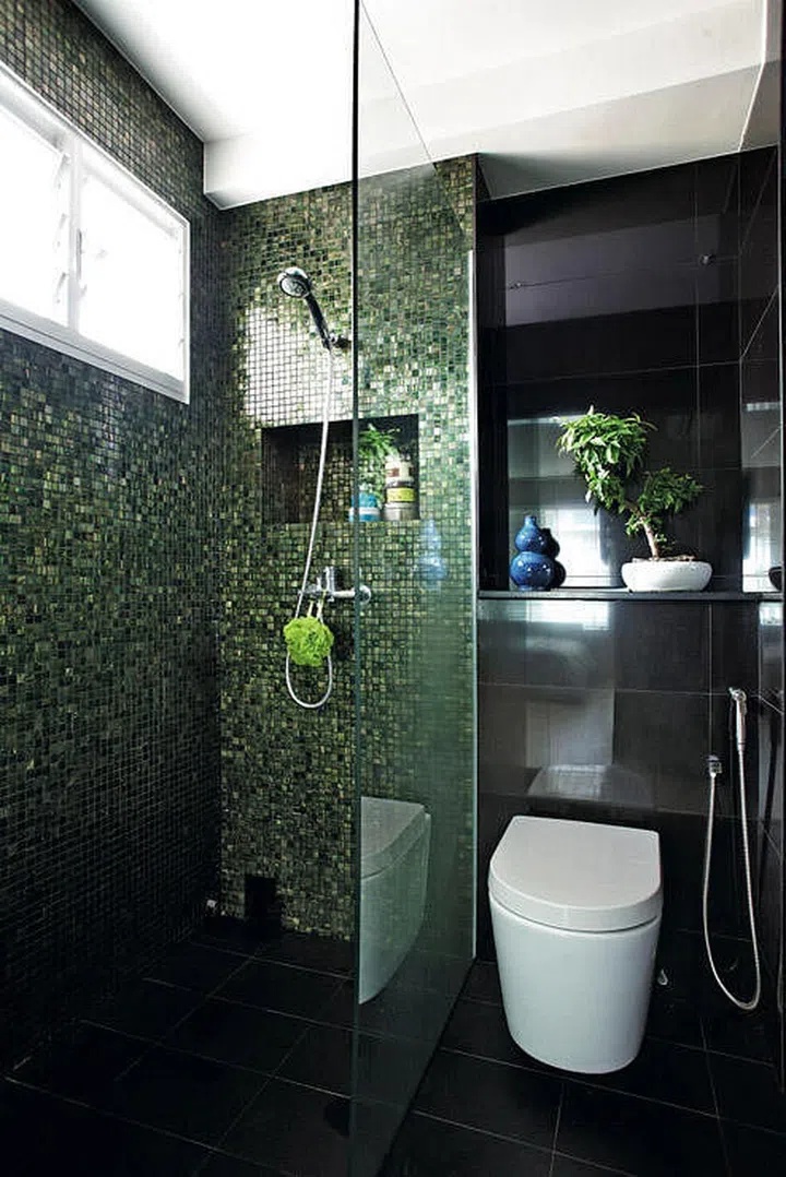 Green mosaic and black tiles laid over the original tiling of the master bathroom enhance the earth elements of the sector.