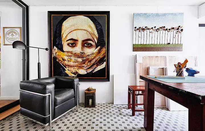 The scarred wooden table is bought from a defunct crocodile farm and holds a prominent position in the living room.