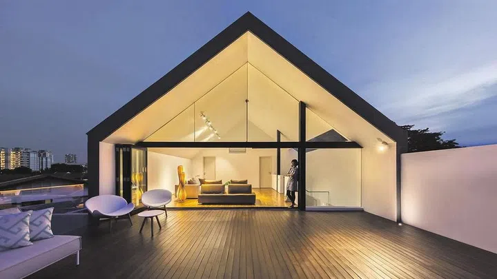The open roof terrace in this house gives the family unfettered views of the neighbourhood and of the Ang Mo Kio Town Garden Hill nearby.
