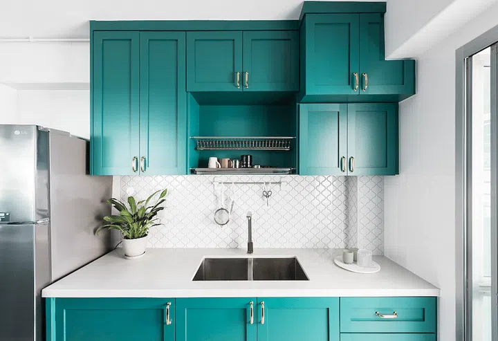 "I suggested a strong saturated green shade for the kitchen; as you can see the kitchen from the living and dining rooms, a punch of colour helps balance out the neutral hues used throughout the home," says Eugene.