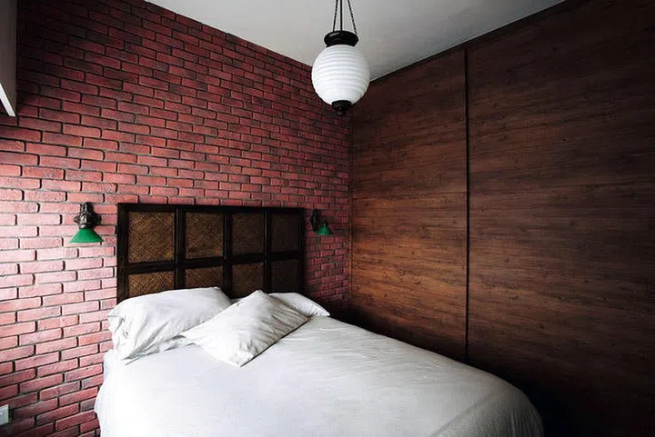 The raw brick wall and uneven wood grain of the wardrobe panelling lend the bedroom an earthy, rustic feel.