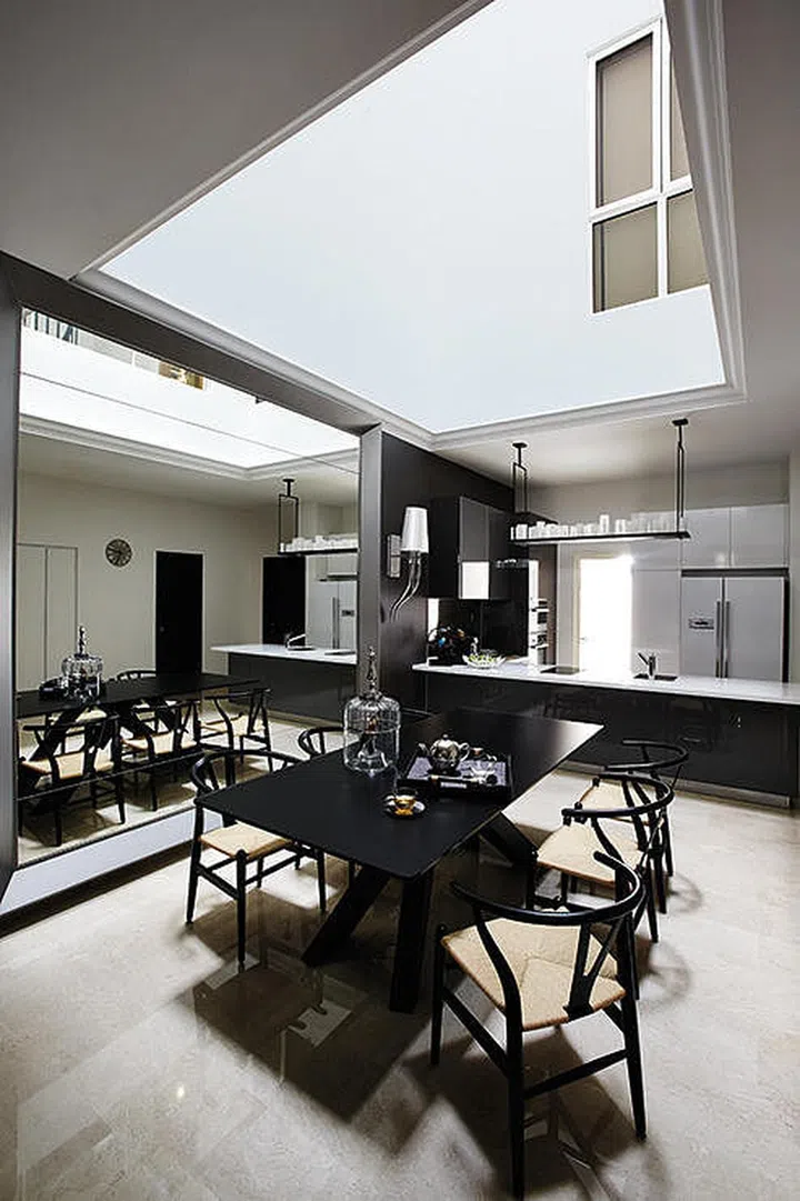 The designer installed a large frame in the dining area, which sits right under a skylight, to maximise natural illumination and create a focal point.