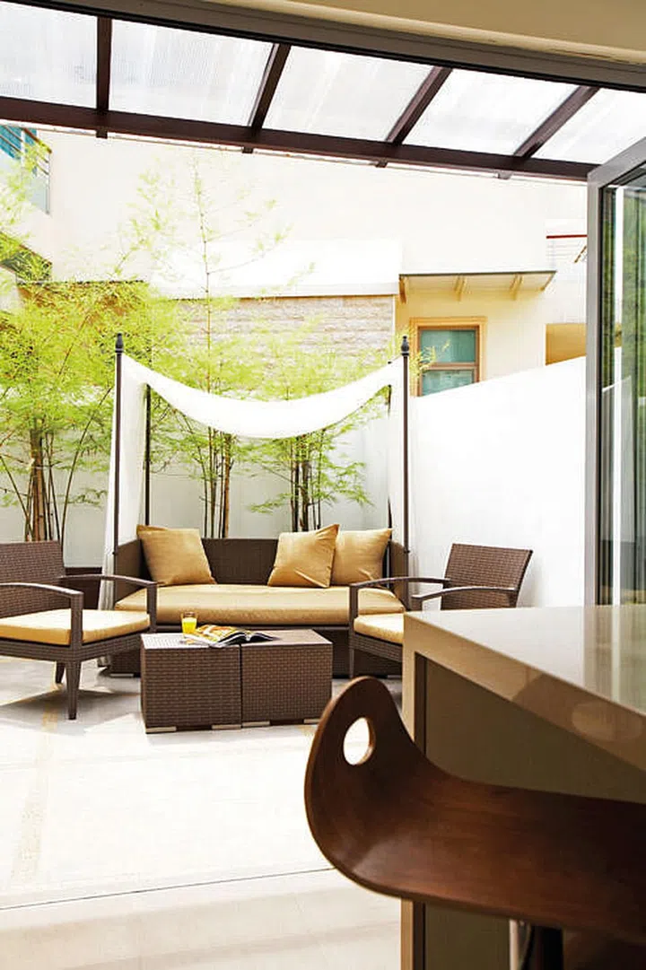 This intermediate terrace house in Serangoon Gardens has a light colour palette and lots of windows and glass walls to brighten up the interior spaces.