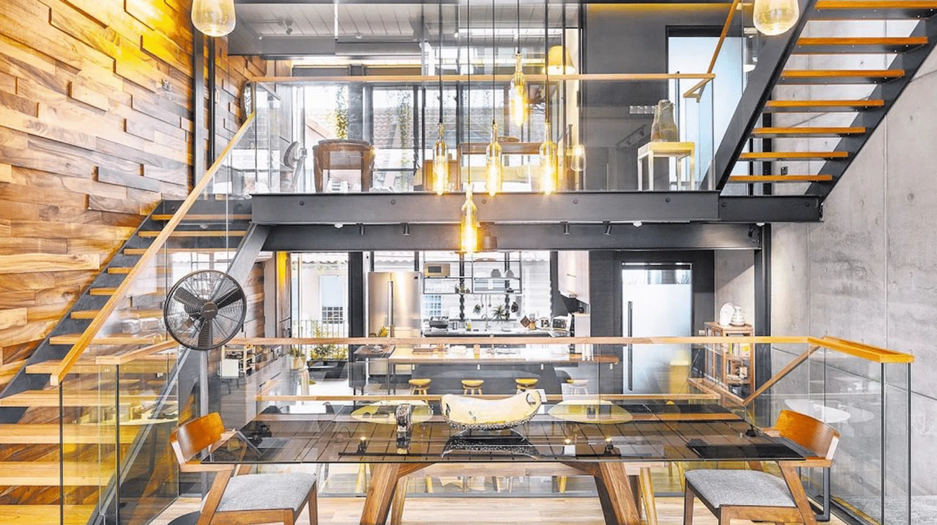 “I wanted the industrial style to come through as authentically as possible,” shares Ed, the designer of this house, who used construction beams or metal I-beams at the front and back of the ground floor of the home.