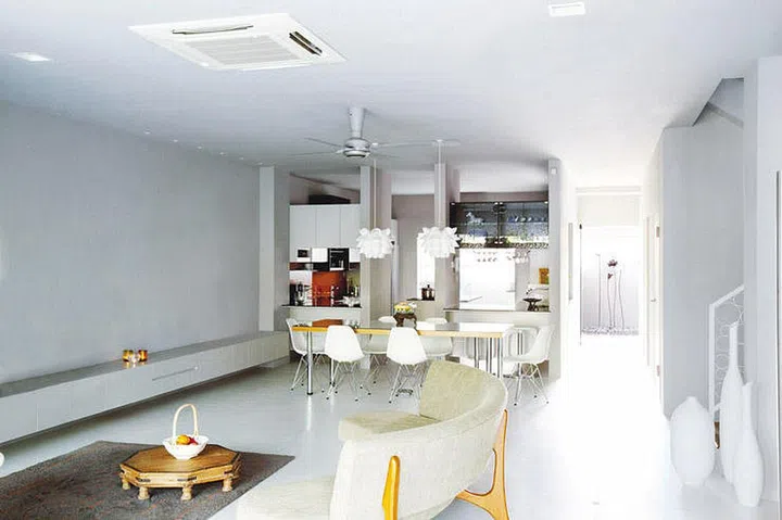 The once dark and stuffy two-storey terrace was transformed into a three-storey home that is illuminated by a skylight and kept well-ventilated by air extractors on the roof.