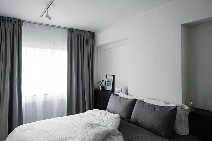 The master bedroom has grey as the dominant colour for a minimalist, Scandinavian-inspired vibe.