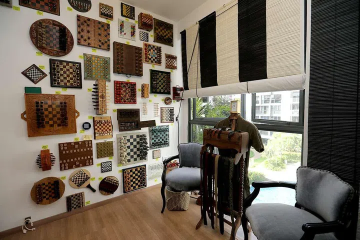 Themed chess sets that the couple collected as travel souvenirs dot a wall in the guest room. Black-and-white bamboo blinds are installed at the windows.