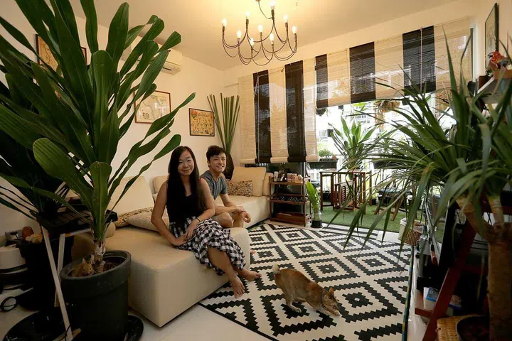 Mr Clarence Chua and Ms Candice Li were so inspired by their honeymoon in Africa two years ago that they decided to decorate their five-room executive condominium in Bukit Panjang in the tropical- colonial style. The living and dining areas of the 1,050 sq ft apartment are filled with lush potted plants that tower above a person of average height and antique-looking wooden furniture.
