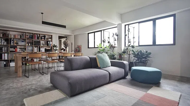 Measuring 969sqf, the flat has a combined living room and dining area. "My partner, Kelvin Chan, and I love to hose gatherings, and this modular use of the space allows us to do that," says homeowner and architect Kenn Goh.