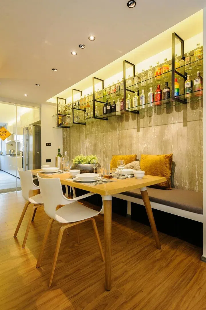 In the living room, interior designer Eloycois Er of Erstudio customised many built-in storage cabinets. Overhead display shelves are added in the dining area, to showcase the homeowners' collection of Vodka bottles.