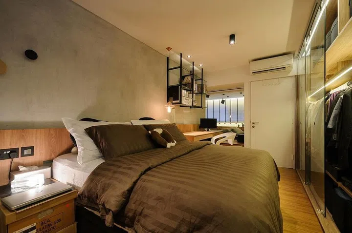 Instead of a walk-in wardrobe, the bedroom next to the master has a built-in wardrobe that stretches the length of the room to offer sufficient storage space. Glass sliding doors help keep the room from feeling claustrophobic.