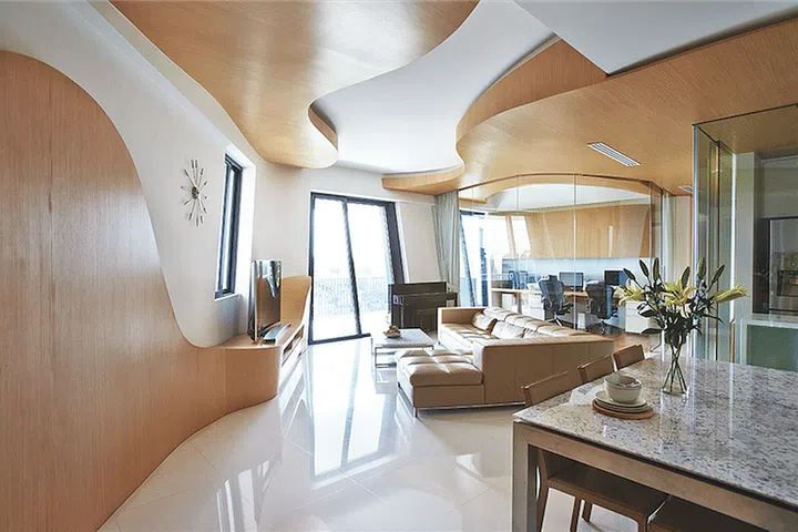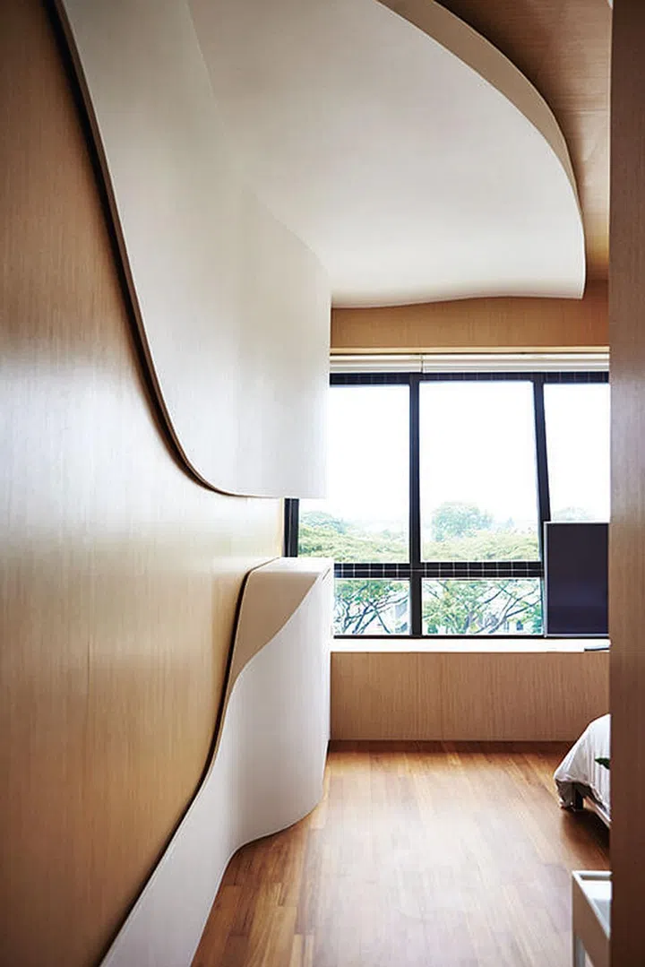 2) Lots of wood and curves in this four-bedroom condo apartment