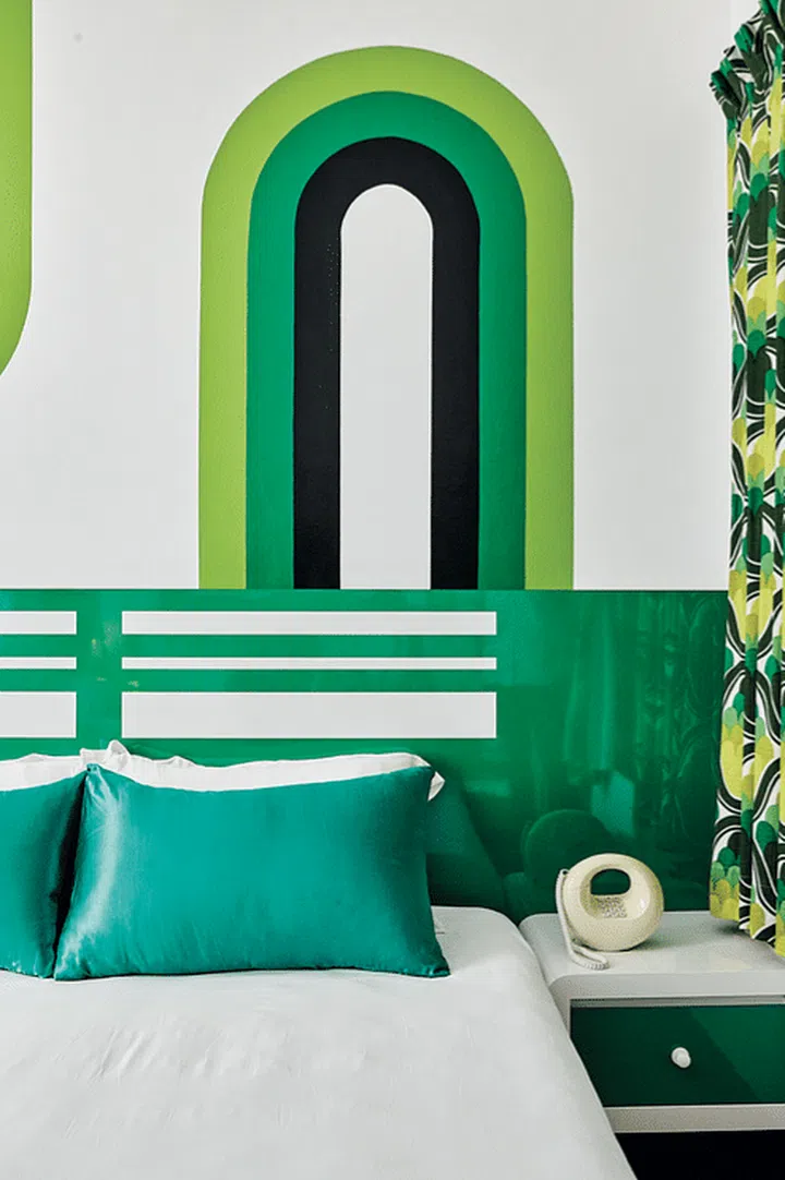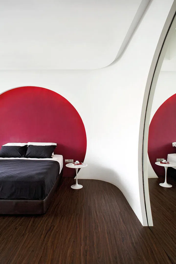 Soft, curved corners and a stand-out circular headboard in crimson creates a retro futuristic yet tranquil sleeping environment for the couple.