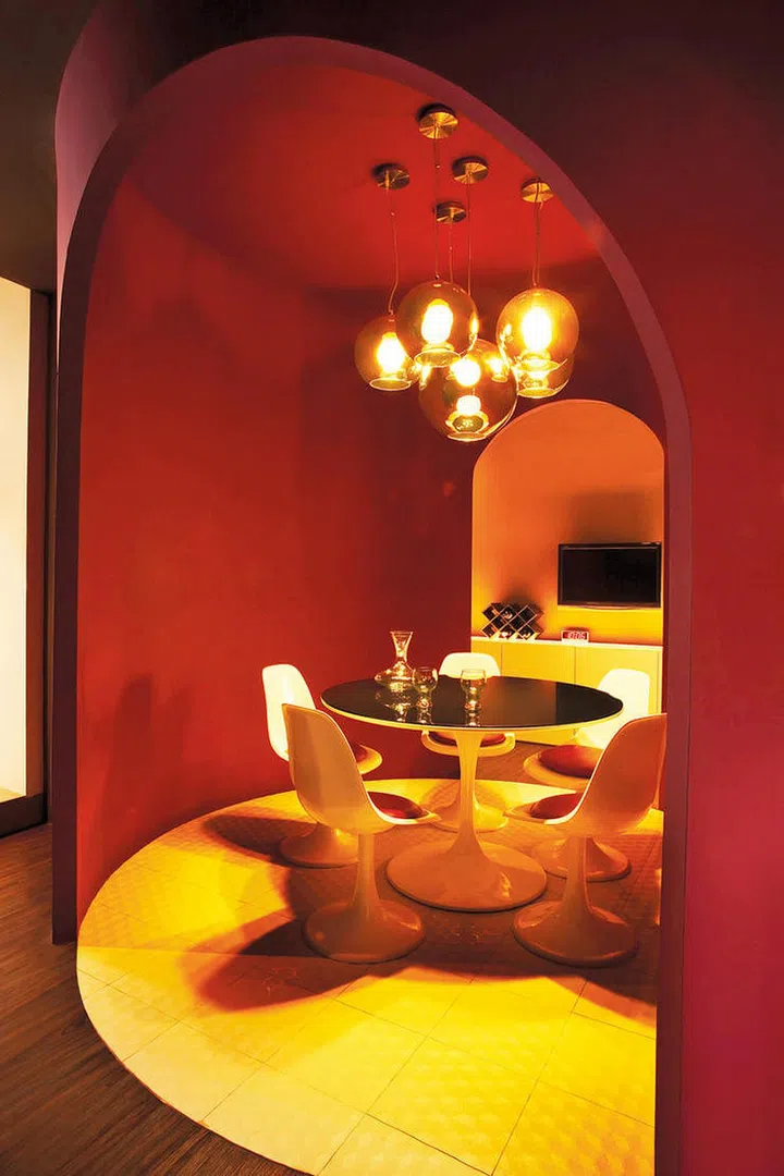 The warm yellow glow emanating from this dining capsule complements its bold burgundy walls, while its rounded furniture and archway match its dotted floor tiles.