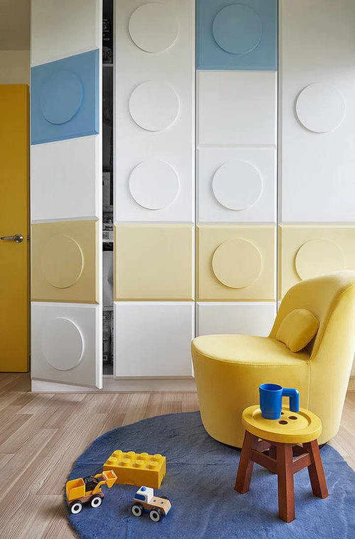 Wood and white neutralise the vibrant hues in the home, and the lego theme continues in the room with this specially customised wardrobe doors.
