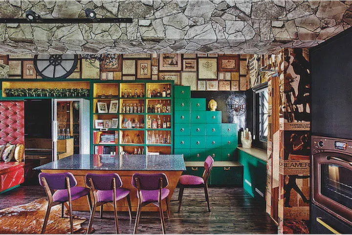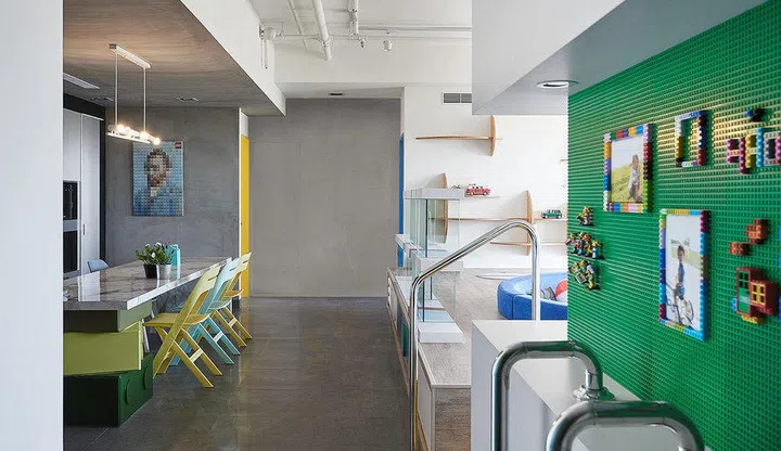 Designed by Taiwan-based firm Hao Design, concrete screed floors and walls give the playful apartment some edge. A lego board is practical and fun!