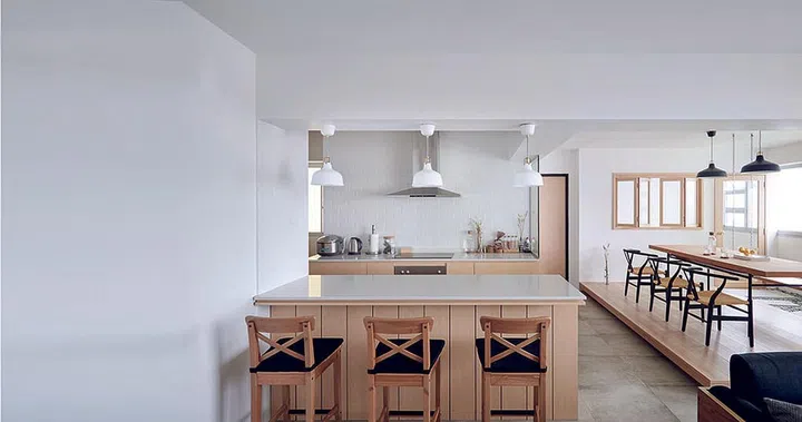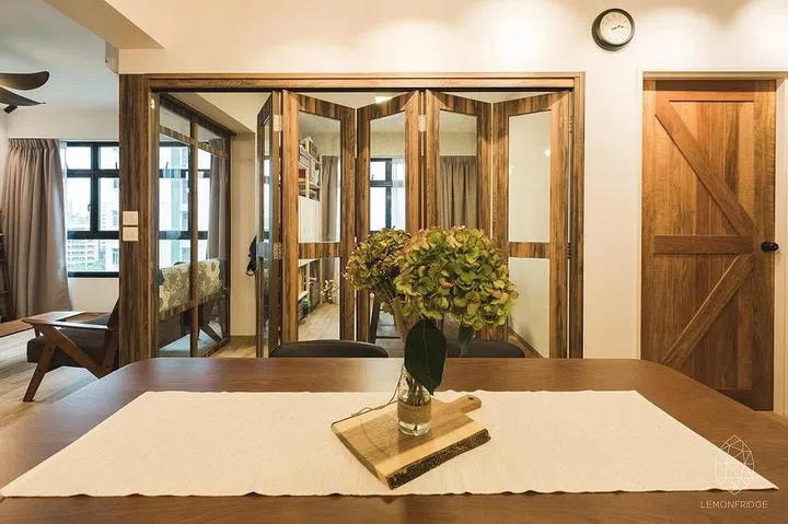 The homeowners of this apartment love the warm and inviting ambience of country- and rustic-style homes, and requested for a similar look. To achieve the style, the designers opted for wood-look finishes, including for the bi-fold doors that replaced the walls allow natural light to fill the kitchen and living room.
