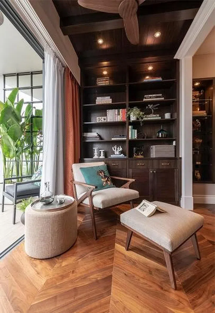 A large bookcase, in a dark finish, which complements the chevron American walnut flooring, houses the owner's books and knick knacks.