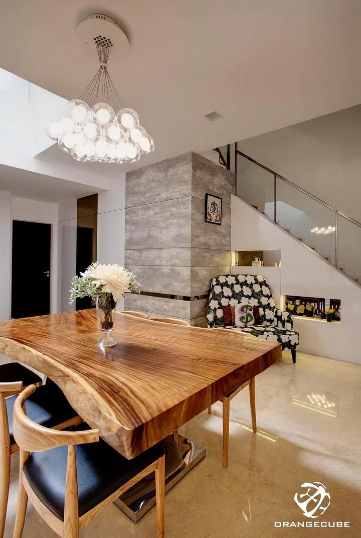 Industrial-style pendant lamps in the dining area and hanging bulbs in the living room add interesting visual elements into this eclectic-style apartment in Bukit Batok. Plywood panels are used for the TV console, which doubles as book shelves too. Mismatched sofa and arm chairs add a fun touch to the living room.