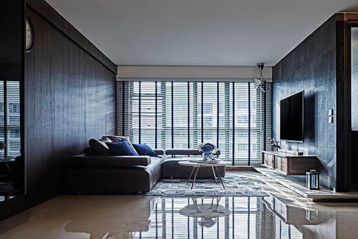 This five-room HDB apartment is cloaked in deep hues. The homeowners — a couple — went for an opulent theme with black and dark colours as they're the wife's favourite shades.