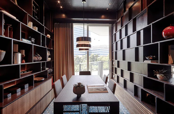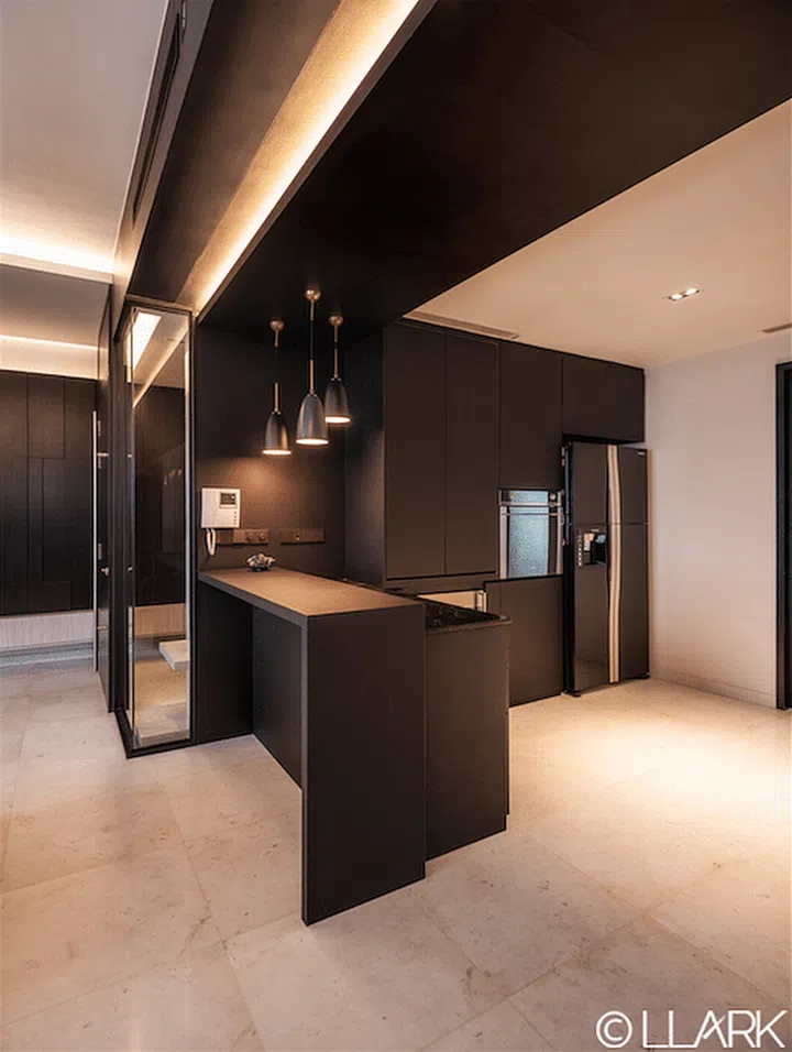3) Four-bedroom condominium apartment with dark coloured finishes and a warm ambience