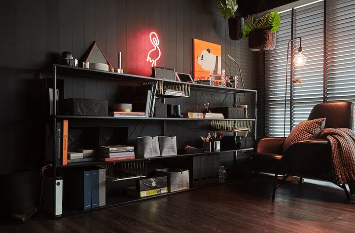 Homeowner Dan Lee says he and his partner, John Tan, are polar opposites. He prefers dark hues, while John likes bright colours; he cycles and John runs. They chose Alvin Oh of AO Studios, who created two full-height shelves that separate three living spaces: the living room, dining room, and bedrooms. Clad in a dark wood finish, these statement pieces check all the requirements. The open shelves are filled with knick-knacks that introduce not only strong colours like red and orange, but also interesting shapes and finishes to the otherwise linear space.