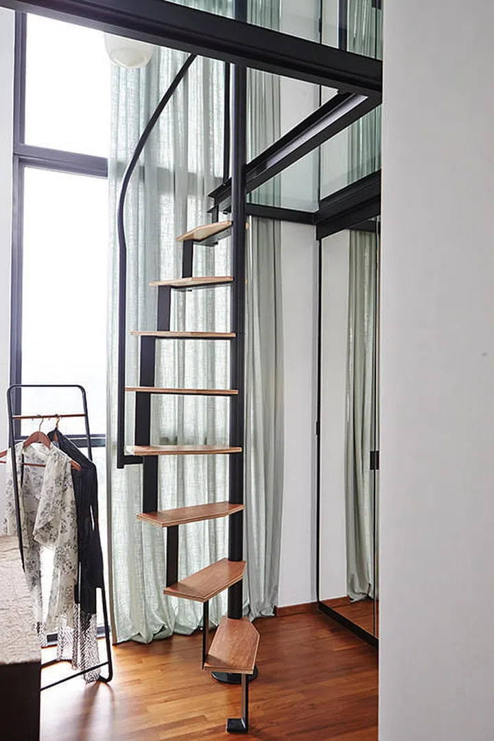 The spiral staircase is repeated in the bedroom-turned-walk-in wardrobe. Having the walk-in wardrobe increased the couple's wardrobe space by seven times.