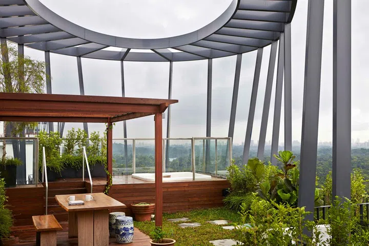 The most pleasant surprise to the owners of this 2,347 sqf, three-bedroom penthouse in Upper Bukit Timah was their rooftop terrace. Fitted with a Jacuzzi, the idea was to create a fully functional extension of the indoor living area, and it includes elements such as cement pavers set into the grass lawn, a wooden deck, a trellis and a built-in barbecue pit with a side sink.