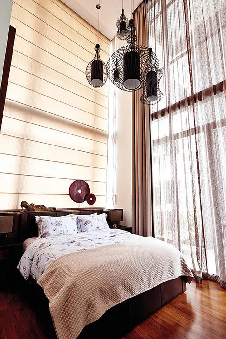 A cluster of ceiling lamps from Lumiere Lighting makes good use and accentuates the double-height ceiling of the master bedroom.