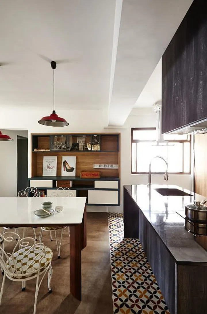 The layout of the home was kept relatively straightforward. The biggest change was made to the kitchen, where Kelly removed the wall separating it from the living area and built a wall-mounted display cabinet along one wall of the dining area.