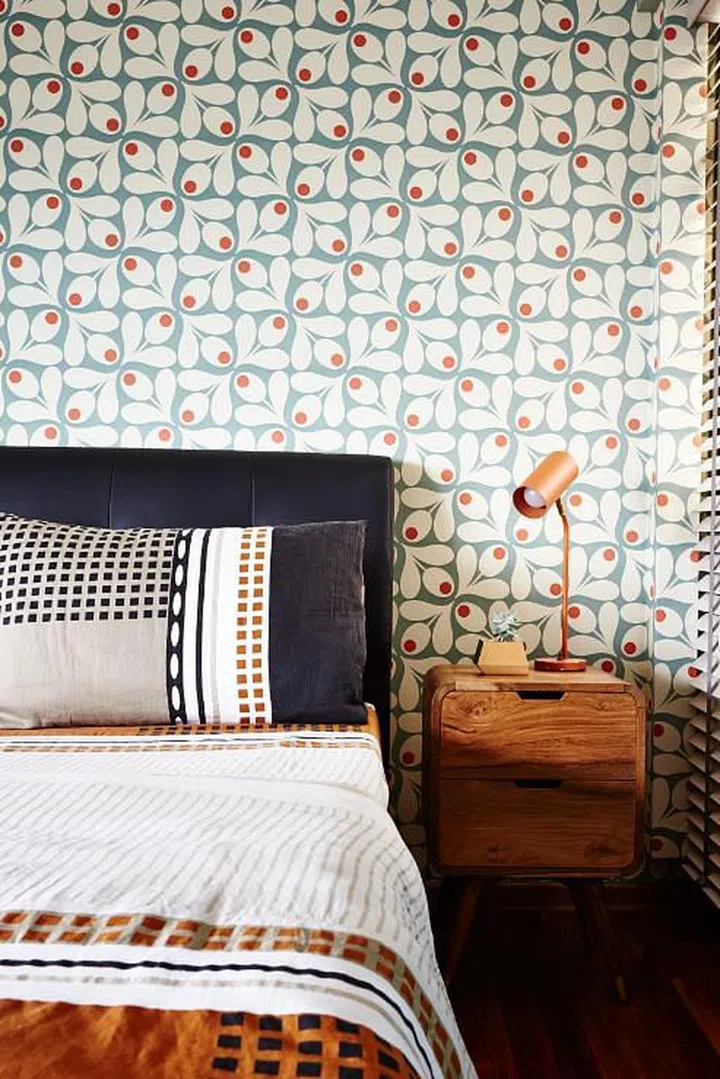 Their love for prints is made apparent throughout the home - in the master bedroom, the wall behind the headboard is covered with a floral retro-inspired wallpaper.