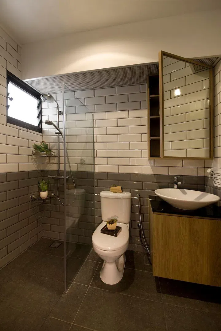 The cool tones of the subway tiles on the washroom's walls give it a clean and polished look.