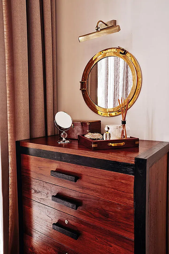 An interesting brass-framed mirror, a trinket box and a tray of decorative items give the room sparkle and shine. The chest of drawers is from John Erdos.