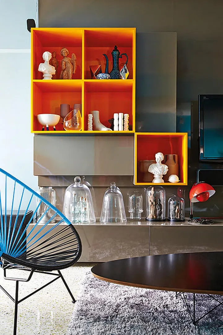 With the help of a contractor, Joseph designed a feature wall that has both closable shelves for storage, and open shelves for display of classical porcelain busts and ceramic wares.