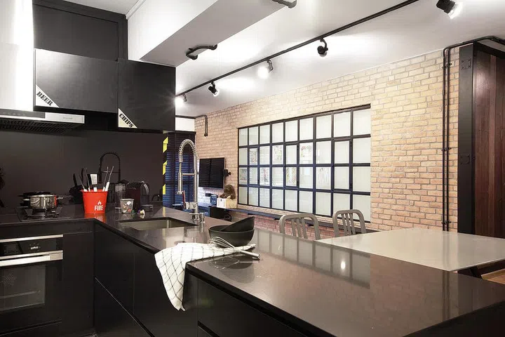 Bridging the dining and living area is a feature wall inspired by the urban industrial areas of New York lofts.