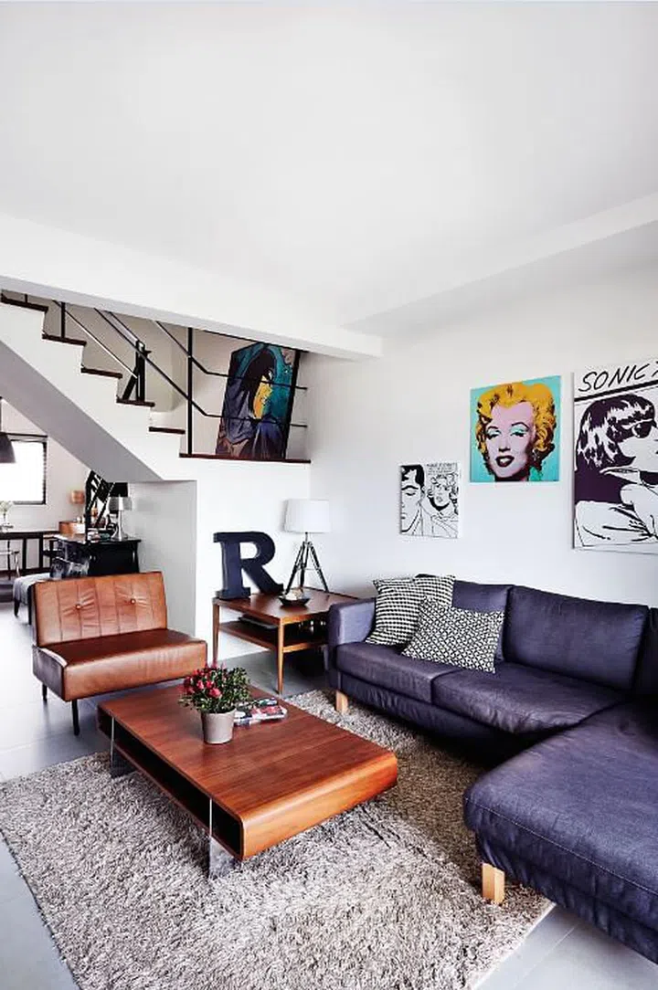 The large living room is furnished in a mix of furniture styles, as well as with colourful pop-up prints purchased online.