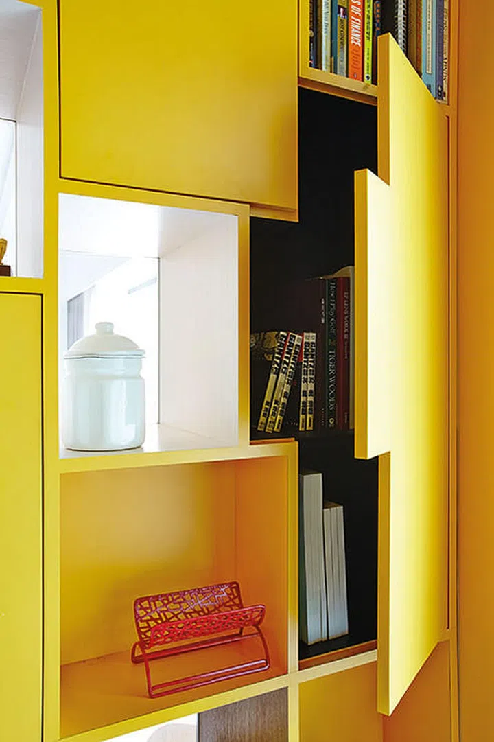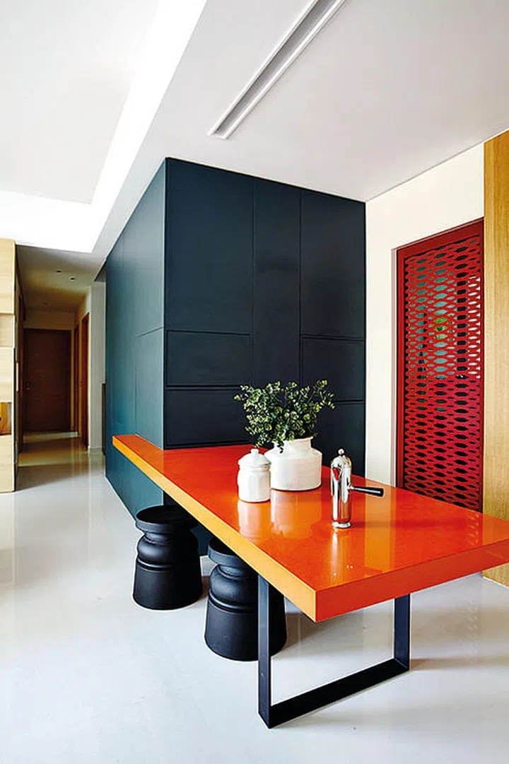Next to the dining area, William built a large Peacock-blue cuboid that disguises storage space and the domestic helper’s room. On closer inspection, the groove lines that mark out the storage panels for tableware become visible. A glossy, bright orange rectangular plane slices into this “block”, creating a sharp contrast between the colours and forms. This horizontal surface acts as the dining table, which is more than enough to accommodate the family of four.