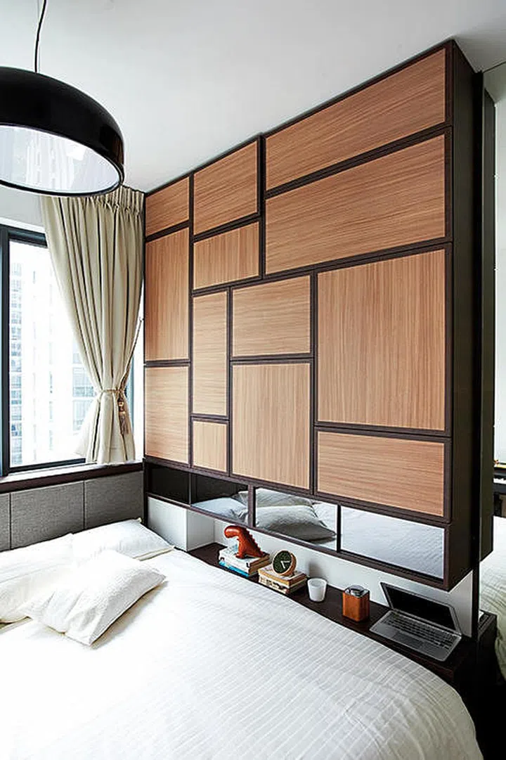 Floor-to-ceiling cupboards double as feature panels while maximising storage space in this compact bedroom.