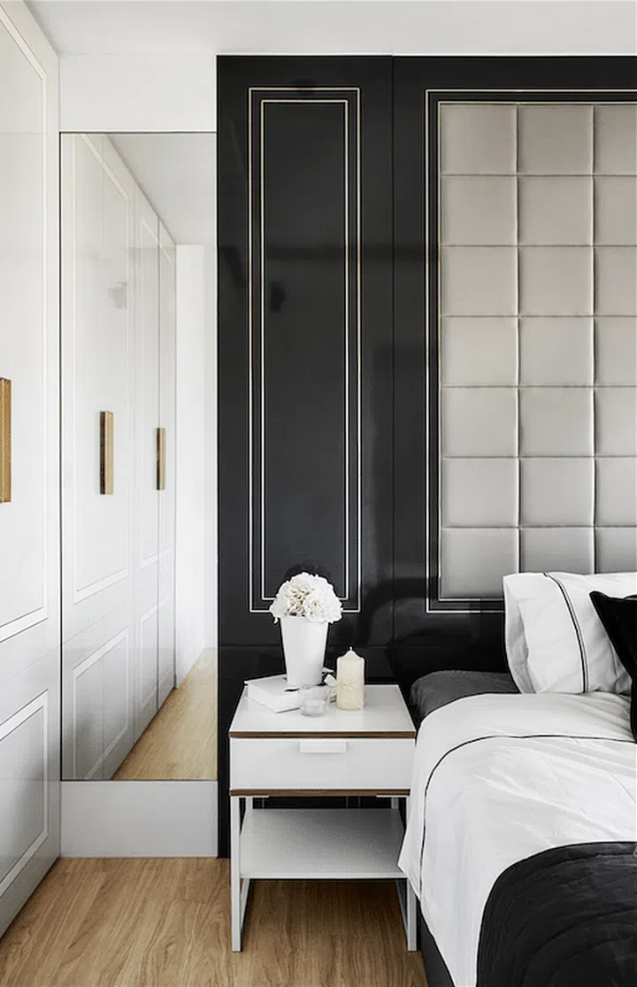 The wardrobe doors of the bedroom have the same rectangular frame motif as the living room and the kitchen carpentry.