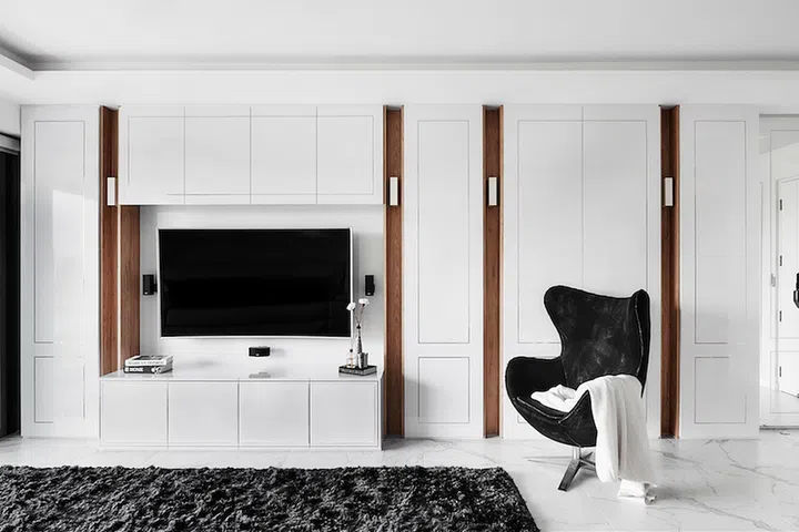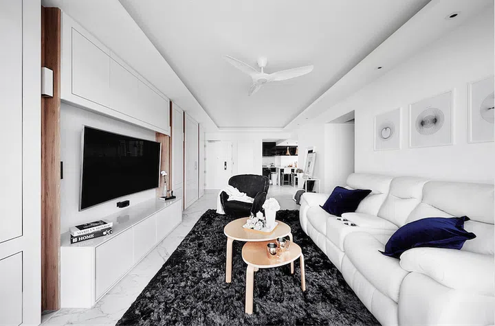 The living room features a predominantly white palette. Built-in cabinets designed like a feature wall run the entire length of the living room to provide storage space that the homeowners needed. The original floor tiles were replaced with marble-look tiles, honed to produce a matte finish.