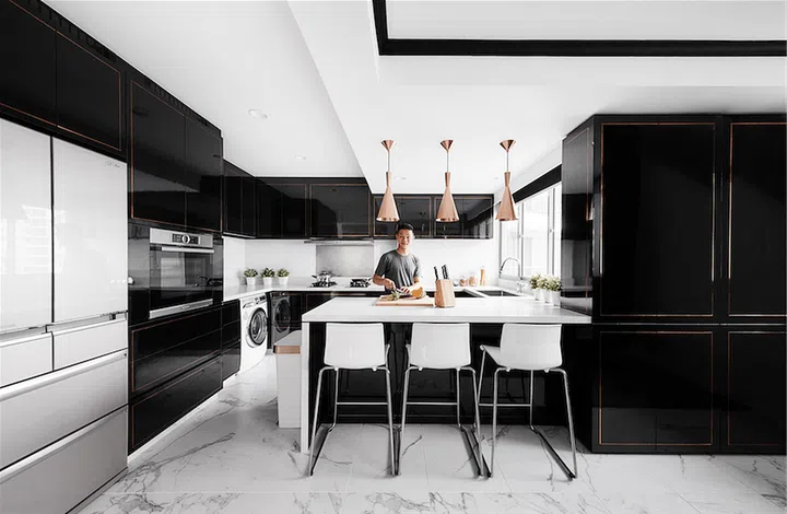 The kitchen is the husband's domain as he enjoys cooking. In contrast to the living room's white palette, the main colour in the kitchen is black to create a more masculine look, complemented by white Caesarstone countertops.