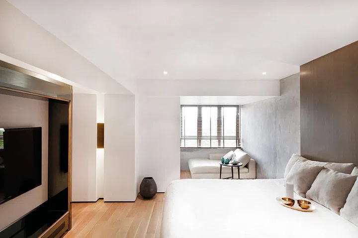 In the bedroom, what used to be part of the balcony that connected with the room next door is now absorbed into the interior floor plan. Its petite size lends itself perfectly to a reading nook where a deep chaise longue contributes to a private corner.