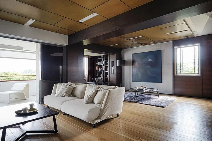 Sliding slatted screens by the window draw the eye away from the lacklustre view and frame the cosy library in the living room.