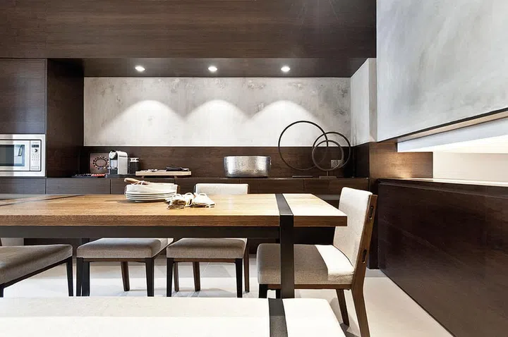 Refined walnut veneer makes a big statement when paired with bare concrete in the dining room, which features a dining set from Commune Home.