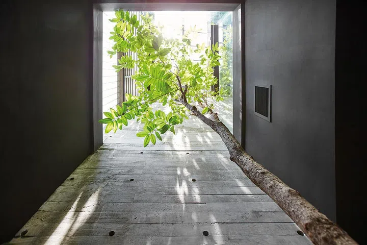 The towering Pink Mempat tree (Cratoxylum formosum), known colloquially as the Singapore Sakura, provides shade above the entrance to the house on the first floor.